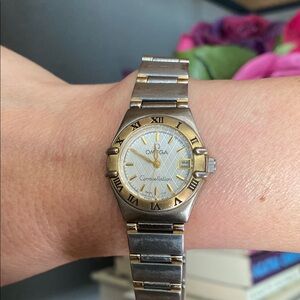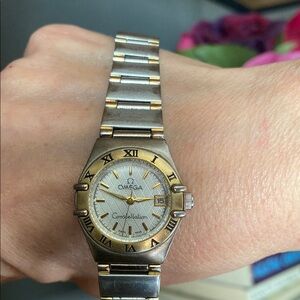 Elegant Omega watch with a two-tone design. Features a silver and gold color scheme. Perfect for any occasion. Has some wear on the links, I have a six inch wrist for scale (see pics). Needs a new battery.
