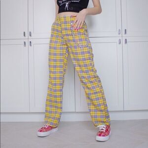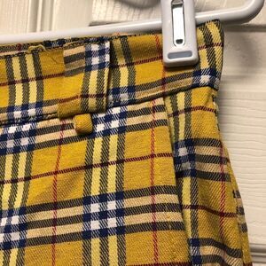 These awesome pants are in great pre-owned condition. There are no rips or holes, but there is supposed to be a chain attached and that’s missing. They have a tab closure. The bottom and edges are roughly hemmed, but if that’s not your thing you can roll them up. The plaid is yellow, blue, white, and red. They are perfect for the current grunge prep style for the fall!