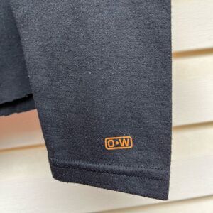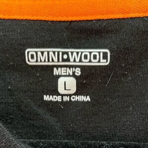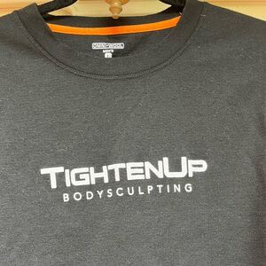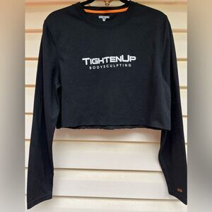 Omni Wool black thermal base, cropped long-sleeved crew neck top. It says Men’s Large but my daughter is tiny Small, and she wore it fashionably. Very cool. TIGHTEN UP body sculpting printed on chest.