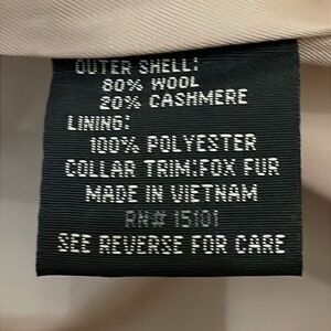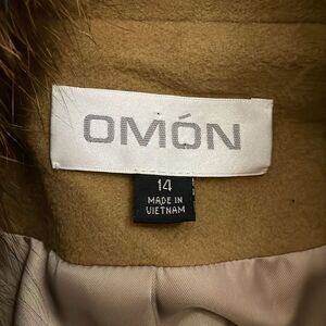 Camel, golden, tan brown, 80% wool, 20% Italian cashmere, belted, long winter coat with a fox fur collar by Omon in a women's size 14. Single hidden button. Belt loops and removable belt. Fully lined in 100% polyester. Dark brown, fox fur is not detachable. Dry clean. Approximate measurements shown in photos. There is a cashmere blend tag still attached to a sleeve which makes me think the coat has never been used and is new without tags. It is in great condition with no signs of wear. Selling as pre-owned. I can't find anything about the brand but according to the RN number, the coat is made by AMEREX GROUP LLC which has licenses with brands like London Fog and Kate Spade.
