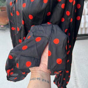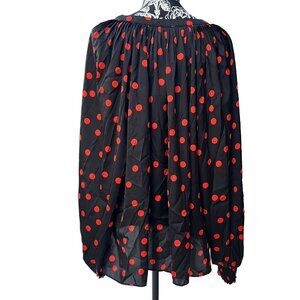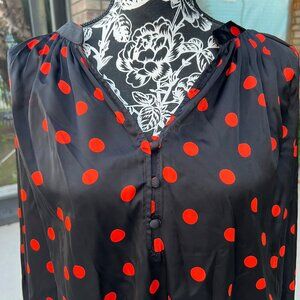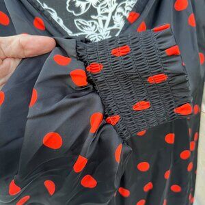 On 34th, polka dot blouse, black and red, 4X, NWT, long sleeve, pleated neckline, smocked cuffs, office, holiday, plus size, v-neck, front button