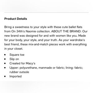 Bring a sweetness to your style with these cute ballet flats from On 34th's Naomie collection. ABOUT THE BRAND: Our new brand was designed for and with women like you. Made for your body, your style, and your truth. As your wardrobe's best friend, these mix-and-match pieces work with everything in your closet.