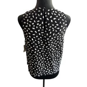 This adorable sleeveless halter top features a white and black design and has a button enclosure. It is brand new with tags.