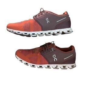 Step into comfort and style with these lightweight On Cloud 50/50 running sneakers. The bold grape and ginger colorway is perfect for active lifestyles, whether you're hitting the pavement or running errands. Featuring speed lacing with elasticated laces, you'll never need to worry about tying your shoes. Slip them on and off effortlessly, and if you prefer a snugger fit, simply retie the knots at the ends for customization. There is some wear on the shoes & inside heels (see pictures for details). Stay active in these stylish, easy-to-wear shoes!