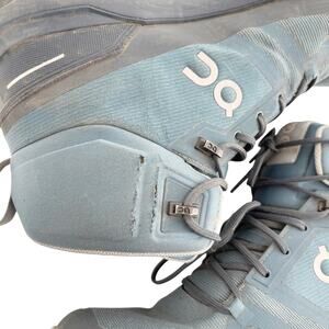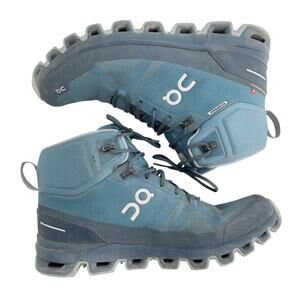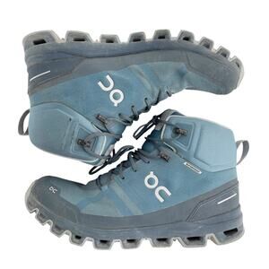 On Cloud Running Cloudrock Waterproof Hiking Shoes Boots in Storm Wash Blue - Womens Size 11, great preloved condition! Some wear throughout. I hiked at Glacier National Park so they are a bit dusty / have wear/tears (see photos) but otherwise in great condition!