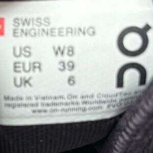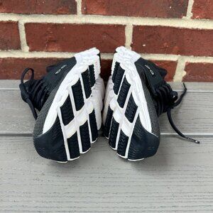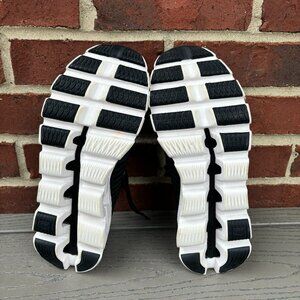 This sock-fit sneaker features a ribbed lacing cage that locks comfortably to a springy Helion foam sole. Has a pull-on sock upper with an external lacing cage, removable memory foam insole, textile and synthetic upper, textile lining, and a rubber sole with a tread that provides superior grip. Excellent condition, with minor marks/dirt/creases throughout, and light dirt/wear to soles, as pictured. In Black/Black Rock. Size 8.
