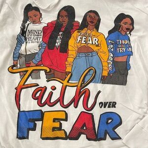 Beautiful, black girl graphic on front with FAITH OVER FEAR graphic on long sleeves