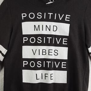 On Fire Positive Mind, Positive Vibes, Positive Life Lightweight Pullover Sweatshirt Hoodie. Size Junior Large. Hooded with drawstring at neck. Dark gray almost black. 100% cotton.