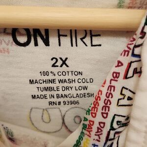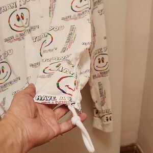 On Fire graphic print, smile faces and words cotton hooded long sleeve T-shirt with side drawcord from under arm going down to the hem.