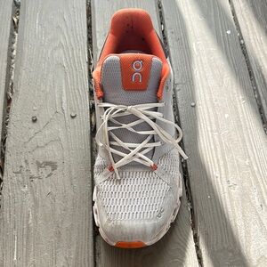 Stylish On Running shoes. White and orange pair with sleek design.