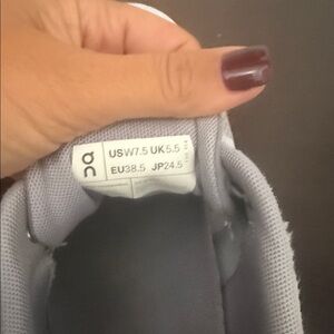 Sleek On Running shoes in charcoal and white. Designed for performance and comfort. Small black stain on top of shoe, with small amount of distressing on one shoe. Gently used but loved Ons. Size women’s 7.5