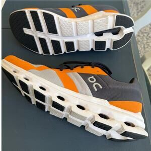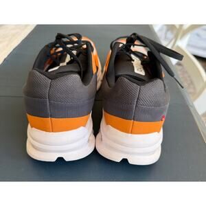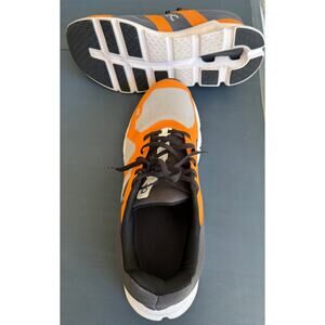 Step into comfort with these On Running Cloud sneakers in a striking orange, black, and white colorway.