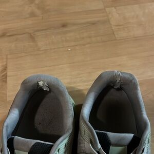 In fair condition. Please refer to photos for wear. Visible wear on treads, discoloration of mesh, and fabric rips near the back heels.