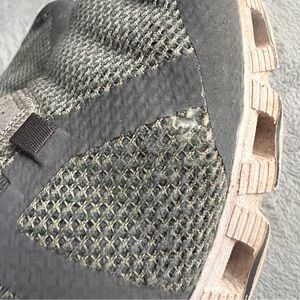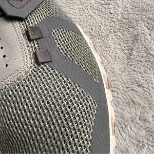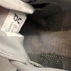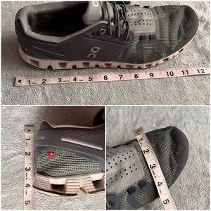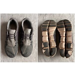 Good-to-fair used condition. Men's Cloud 5 Sneaker by On Running in Kelp Shadow, a dark green shade with gray detailing. Lightweight fully cushioned running shoes made from breathable, antimicrobial knit-weave mesh. Designed for runners that level up their training with mixed sports sessions. Zero-Gravity form and CloudTec® outsole provide soft, cushioned landings. Reshaped Cloud elements deliver superior performance and grip, while the molded heel provides a snug, secure fit. Signature speed-lacing system. Note: moderate wear throughout, with heavy tread/streetwear to bottom soles & discoloration to bottom sole, outsole, upper and insides. Missing insoles. Rubbing/beginning of a hole at one side. See photos and video for condition. Size 11.5, see photos for measurements.
