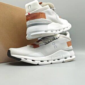 Sleek On Running shoes in white with brown accents. Ideal for active lifestyles.