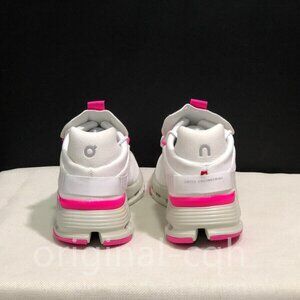 Stylish over the knee boots by On Running. Features a sleek white design with vibrant pink accents. Perfect for a bold look.