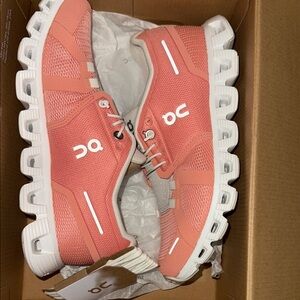 Experience ultimate comfort with On Running shoes. Stylish coral and white design. Perfect for active wear. Flamingo/pearl color. Worn once
