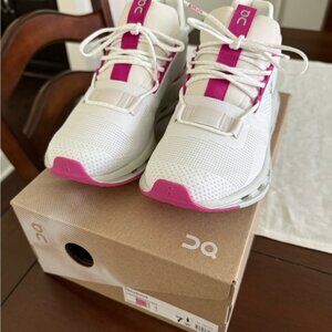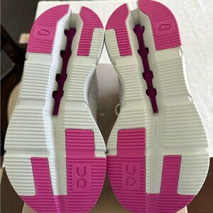 Experience comfort and style with On Running women's running shoes. Featuring a sleek white design with vibrant pink accents, these shoes are perfect for your active lifestyle.