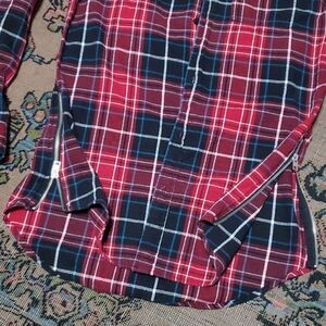 On The Byas Flannel Shirt Black Red Plaid Longer Length Zipper Sides Women's M