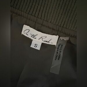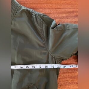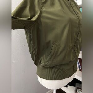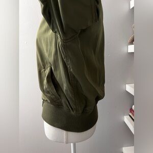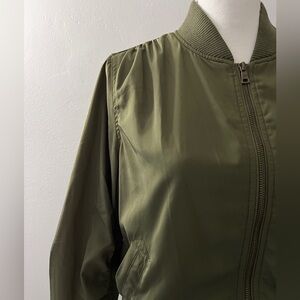 On the Road Bomber Jacket Women Medium Tencel Lyocell green Zipper front. Ruched sleeves.