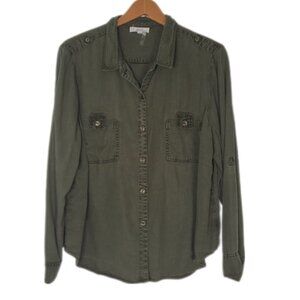 On The Road soft shirt military style 100% tencel roll sleeve women's size LG olive green. Casual timeless soft military neutral rock.