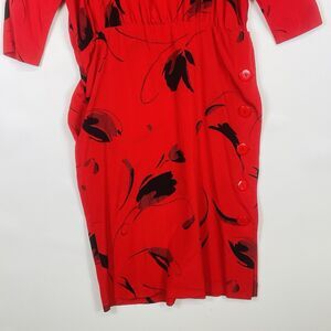 On The Rocks Vintage Red Black Graphic Print 80s Style Office Secretary Dress. Loose sleeves, buttons down the side of the skirt, shoulder pads. Womens 7/8.