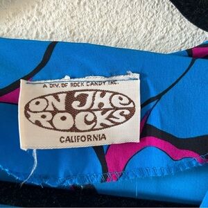 On The Rocks Vtg Dress Fit Sz Medium Blue Pink 3/4 Sleeves Cross Front Chest in great vintage condition/ elastic waist non stretch material/ silky material