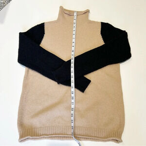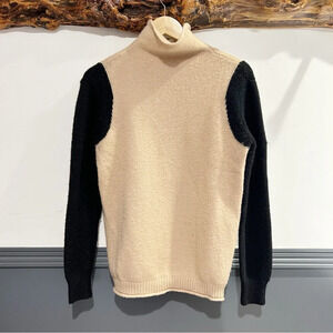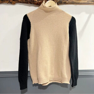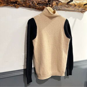 Stay cozy and stylish with this elegant cream and black turtleneck sweater. Perfect for any occasion, it offers both comfort and sophistication.