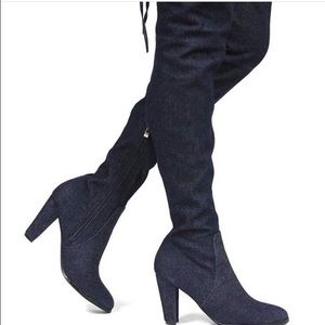 All denim EVERYTHING. Over the Knee Boots and Denim are two of the seasons biggest trends that has now been combined! Get these comfortable Chunky heeled boots for a great for yourself or as a gift!