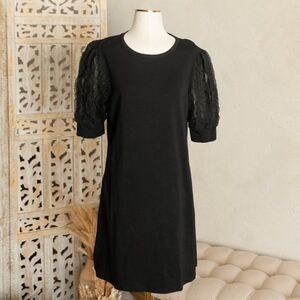 Keywords: t-shirt dress, black dress, lace sleeves, puff sleeve dress, casual dress, elegant dress, short sleeve dress, womens dress, little black dress, trendy dress, day dress, party dress, basic dress