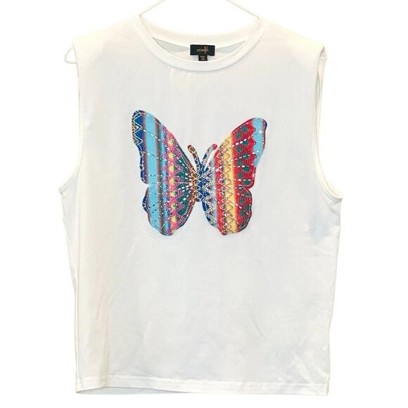 This sleeveless top features a delicate butterfly design embellished with colorful embroidery and sparkling beadwork on a soft white striped fabric. Lightweight and easy to style, it’s perfect for warm weather or layering under a jacket. Finished with a relaxed fit and subtle shimmer details that catch the light beautifully.