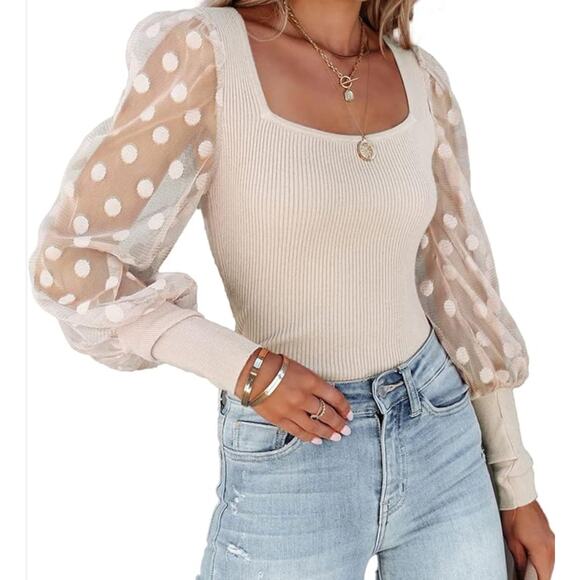 Chic Top · Feminine Style · Sheer Sleeve Blouse · Polka Dot Trend · Romantic Aesthetic · Square Neckline · Soft Knit · Elegant Casual · Textured Fabric · Neutral Cream · Modern Classic · On Twelfth Style · Date Night Top