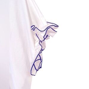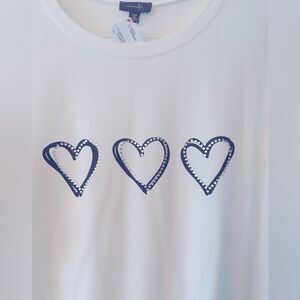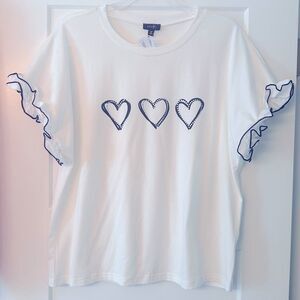 Adorable tee with flirty ruffled sleeves with black piping. Three rhinestone covered hearts Grace the front. Relaxed fit. Size XL