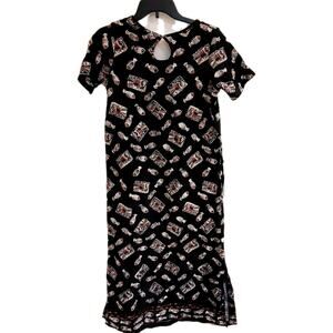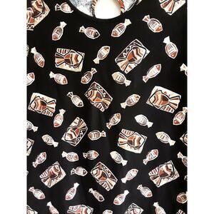 This dress is a women's size small long maxi dress with a fish design, perfect for a casual occasion. Made of 100% cotton fabric, this pullover dress features a crew neck and short sleeves with a raglan sleeve style. The dress is accented with a side slit and is machine washable. The colorful fish pattern adds a unique theme to the dress, making it a stylish choice for any season.