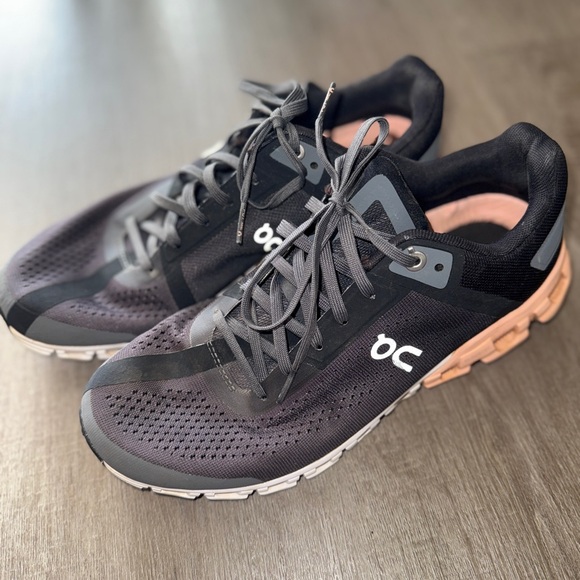 These On Cloudflow Running Shoes are in preowned condition. They do have some wear and tear due to being preowned see photos. Some wear on the bottoms. Photos These are the exact shoes you will be receiving.