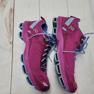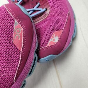 Cool Onrunning active shoes! Purple knit with springy soles. Shoes have some flaws which include: Color fading to soles, few scrapes to metallic detailing on toes, and they are MISSING their inseams. No severe wear to tread or interior backs of shoes. Size 10