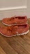 On sneakers - women’s 9.5. In a pink salmon/clay color. Barely worn but have a mark on the top front of the right foot
