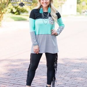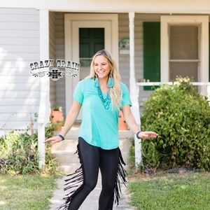 Women's black leggings with fringe down the sides. Very stretchy and comfortable with an elastic waist band. Fringe is 7 inches long.
