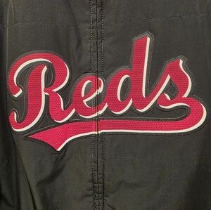 This is a Majestic Cincinnati Reds full-zip jacket, part of the brand's authentic or on-field collection from the mid-2010's era before Nike took over MLB apparel. The jacket is black with red and white accents, featuring the classic "Reds" logo across the chest and often an embroidered Majestic logo on the sleeve.