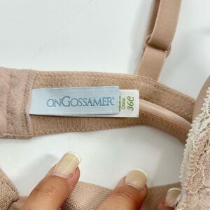 OnGossamer Neutral Lace Front Underwire Plunge Bra with Mesh Back 36C. In excellent barely worn condition. Has cream lace detail on front cups. Adjustable straps and back hook and eye. Lightly padded.
