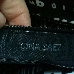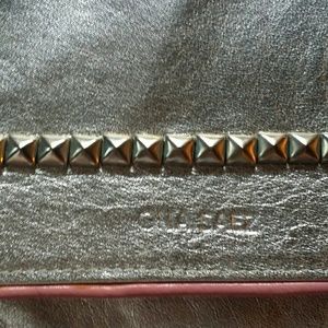 This is a very edgy bag! It is silver metallic leather with pink accents. It also has chains and some studs on the front and shoulder strap. It is very high quality and great for a night out! It includes a zipper pouch inside and it is an incredibly unique bag sure to catch people's eye!