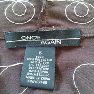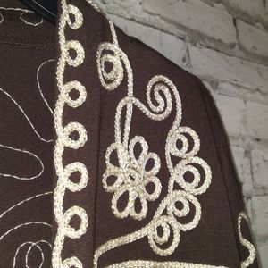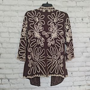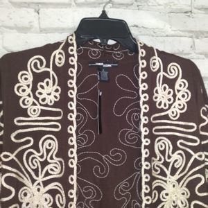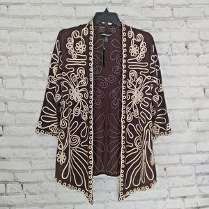 Once Again Open Front Cardigan Womens Small Brown Gold Ribbon Boho Elegant Artsy