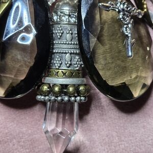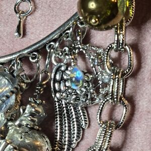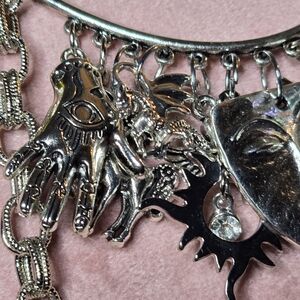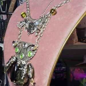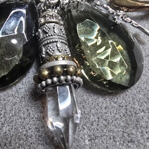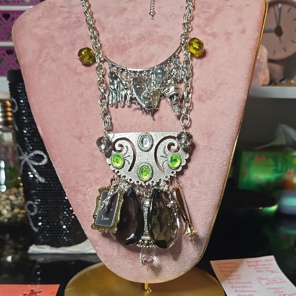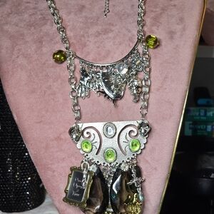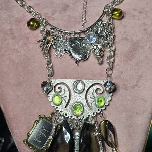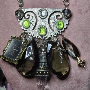 Eye-catching silver-tone necklace featuring bright lime-green and smoky brown crystal accents. Elegant layered design with dangling, smoky crystal teardrops and green bezel stones for luminous sparkle. Goth style; Steampunk style, perfect for everyday or Comicon & festival events. Live the memory of a life in days of olde, where knights defended the honors of his king & queen, his God, the country, its citizens and its resources and beliefs. Silver charms are abundant and relate to fantasy, myth and history. Image yourself in this hypothetical era with dragons, angels, Pegasus, jewels, palmestry, alchemy and spirituality. Perfect for adding a pop of green and refined shine to evening or casual looks. Suitable for men, as well as, women.