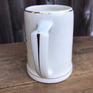The mug is 4-3/4 inches high and has an opening of 3 inches. It’s base is slightly bigger at 3-5/8 inches. The mug is in amazing shape with no blemishes, cracks, or stains.