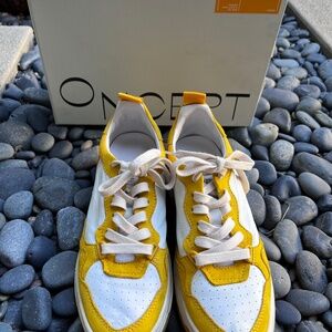 Oncept Phoenix sneaker in yellow - new this season, still on line at $275. Excellent condition - worn once outdoors but no signs of wear. From the website: "Meet the Phoenix, the courtside sneaker designed to take you from the sidewalk to the street with effortless cool. We've updated this retro style of the early 90's with sleek lines and ultra-soft material for a timeless new look. Featuring new SS24 color ways, organic cotton laces, luxe butter leather, and our signature re-speckled soles." Size 8 fits true-to-size.