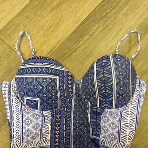 It is a beautiful bathing suit. It’s design allows you to wear the straps two different ways. It has a set that goes over your shoulders and it also has a set that ties around your neck. They are removable. The fabric is very supportive and the back and legs are hi-cut. Adorable