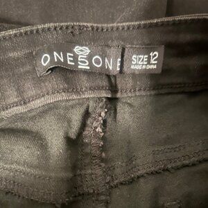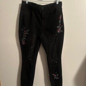 One 5 One Black Floral embroidered 5 pocket distressed skinny jeans, size 12 (84% Cotton, 32% Polyester, 2% Spandex)