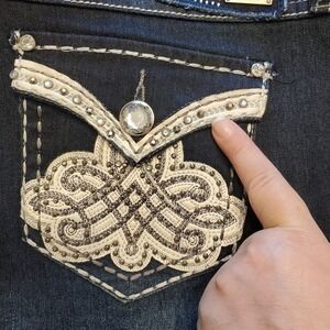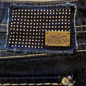 One 5 One Women's Size 14 Plus Jeans Embellished Pockets Dark Wash Flare Leg. These jeans are missing one rinnestone on the back pocket. Please see pictures for details. Thank you.