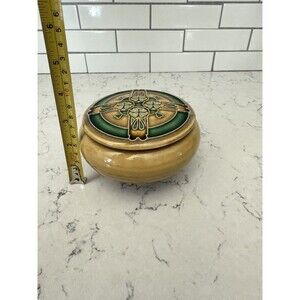 This is a handmade ceramic trinket box by One Acre Ceramics, featuring a round shape with a geometric pattern in multicolor. The trinket jar has a missionary style design, making it a unique and decorative piece for storing jewelry or small items. Produced in 2013 using art pottery techniques, this studio-crafted. Beautiful piece!
