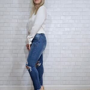 Stylish and comfortable, these distressed blue jeans from One by One Teaspoon are perfect for any casual outing. Size 29 and in excellent condition. Inseam measures 26", rise of 8" and waist is 15"